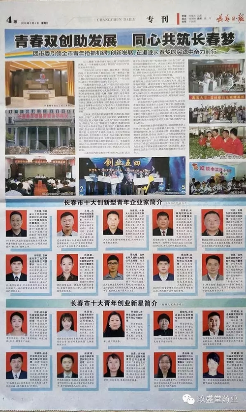 5月4日,中共長春市委組織部、中共長春市委宣傳部、共青團長春市委員會、長春市發展和改革委員會、長春市科技局、長春市工業和信息化局、長春市人力資源和社會保障局7家單位將聯合開展“長春市青年雙創之星”評選表彰活動,吉林省玖盛堂醫藥藥材貿易有限公司總經理王瑩被評為“長春市十大青年創業新星”。