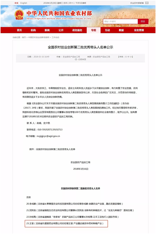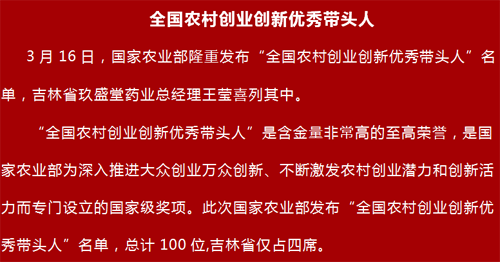 喜報 | 吉林省玖盛堂藥業有限公司總經理王瑩榮獲“全國農村創業創新******帶頭人”稱號