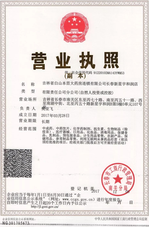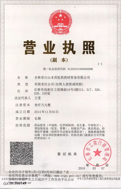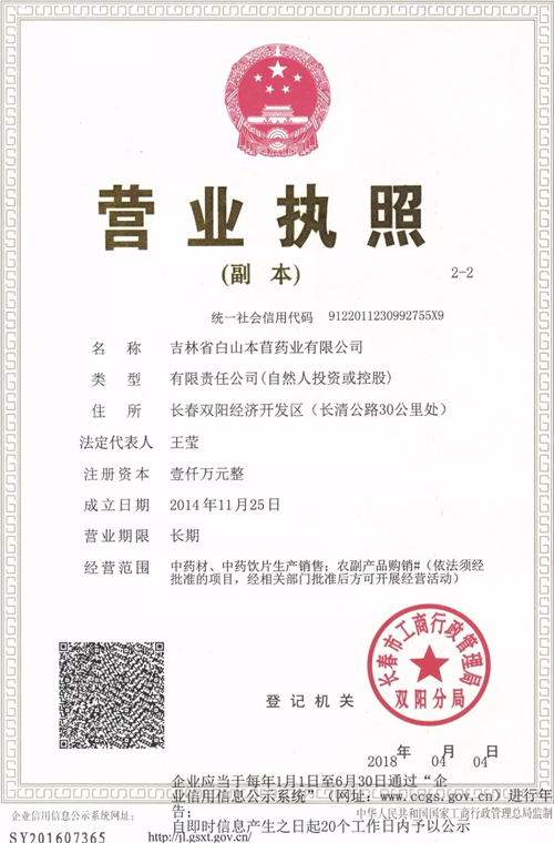 我們非常榮幸地通知各位, 為適應市場和我公司戰略發展的需要, 擴大生產經營規模、完善產品。 現決定將我公司名稱由原來的 “ 吉林省玖盛堂藥業有限公司 ” 變更為 “吉林省白山本苜藥業有限公司 ”,旗下“吉林省玖盛堂醫藥藥材貿易有限公司”變更為 “吉林省白山本苜醫藥藥材貿易有限公司 ” ,“吉林省玖盛堂連鎖大藥房有限公司”變更為“吉林省白山本苜大藥房連鎖有限公司”。上述新公司名稱已通過中華人民共和國國家工商行政管理總局審核,并在當地登記機關正式登記。即日起,公司所有對內及對外文件、資料、開具發票、賬號、稅號等全部使用新公司名稱。