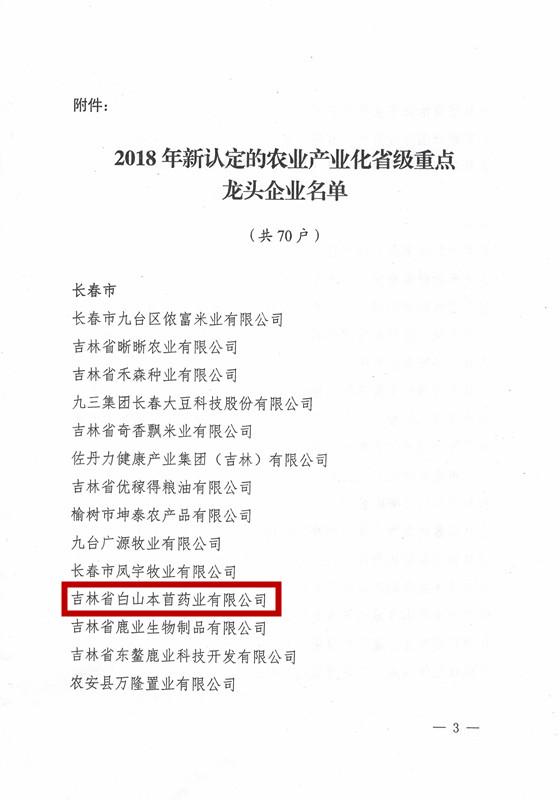 2018年11月22號,吉林省白山本苜藥業(yè)有限公司喜得佳音,榮獲農(nóng)業(yè)產(chǎn)業(yè)化省級龍頭企業(yè)稱號。標(biāo)志著我公司在規(guī)模和經(jīng)營指標(biāo)上都達(dá)到了規(guī)定標(biāo)準(zhǔn),并經(jīng)政府有關(guān)部門認(rèn)定的企業(yè)。