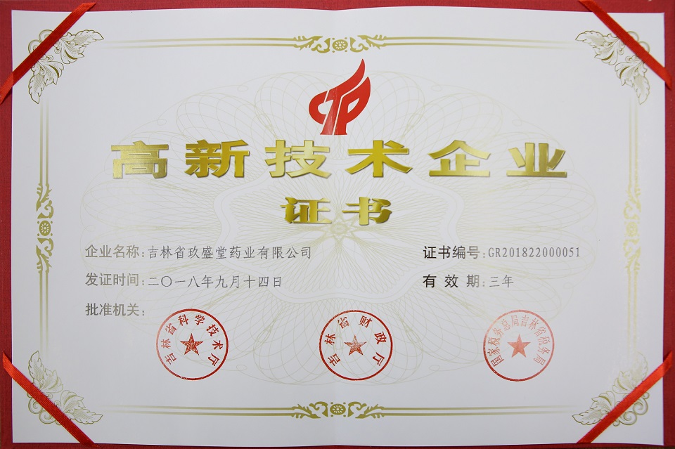 國家稅務總局吉林省稅務局、吉林省科學技術廳、吉林省財政廳發布《關于公布吉林省2018年******批國家高新技術企業認定結果的通知》吉林省白山本苜藥業有限公司榮獲“國家高新技術企業”稱號。