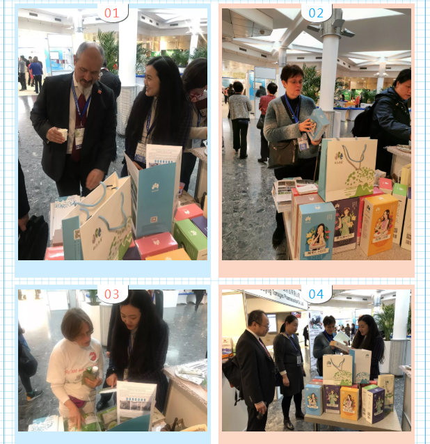 貼心的為各國朋友準備茶飲,深受外國友人的喜愛。白山本苜藥業(yè)總經(jīng)理王瑩為到訪參會人員介紹產(chǎn)品功效,宣傳中國中醫(yī)藥文化。