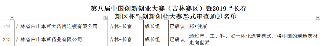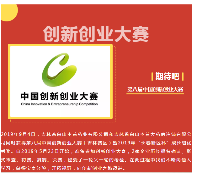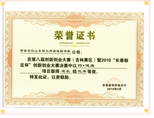 吉林省白山本苜大藥房連鎖有限公司:第八屆中國創新創業大賽(吉林賽區)暨2019“長春新區杯”創新創業大賽決賽中以藥·健康項目取得成長組******等獎。